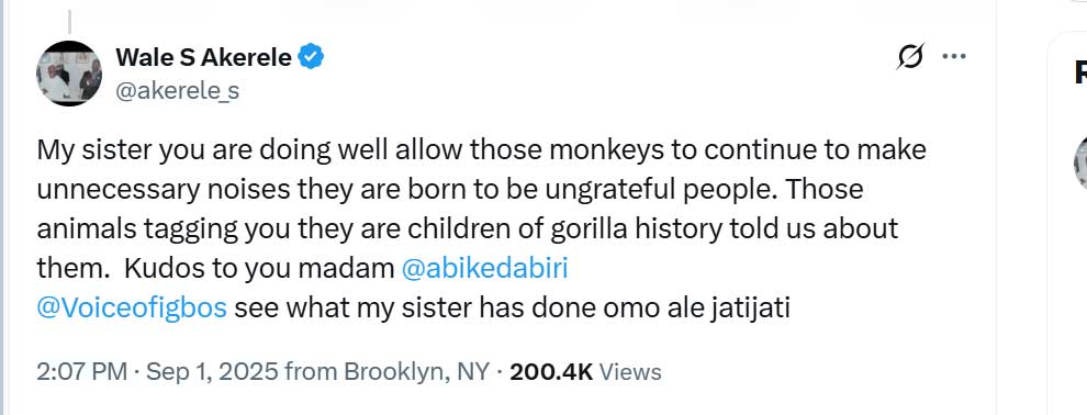 The reply purportedly dropped by Wale Akerele contained these texts: “My sister you are doing well allow those monkeys to continue to make unnecessary noise they are born to be ungrateful people. Those animals tagging you they are children of gorilla history told us about them. Kudos to you madam” he then tagged @abikedabiri and @voiceofigbos, telling the former to “see what my sister has done omo ale jatijati”.